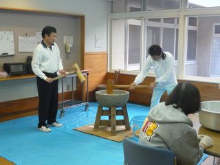 お餅つきを行いました。鏡餅用のお餅を昔ながらの杵と臼で作っています。