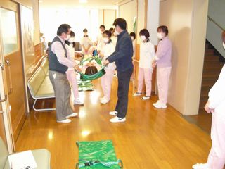 本日は避難訓練を行いました。写真は担架の使い方について確認しているところです。