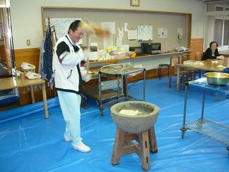 今日はお餅つきです。施設長や職員、入寮者が杵でついたお餅を皆で丸めました。