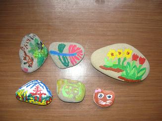 アートセラピーで、ストーンアートに取り組みました。石に絵の具で自由に絵を描きます。石を水で洗えば