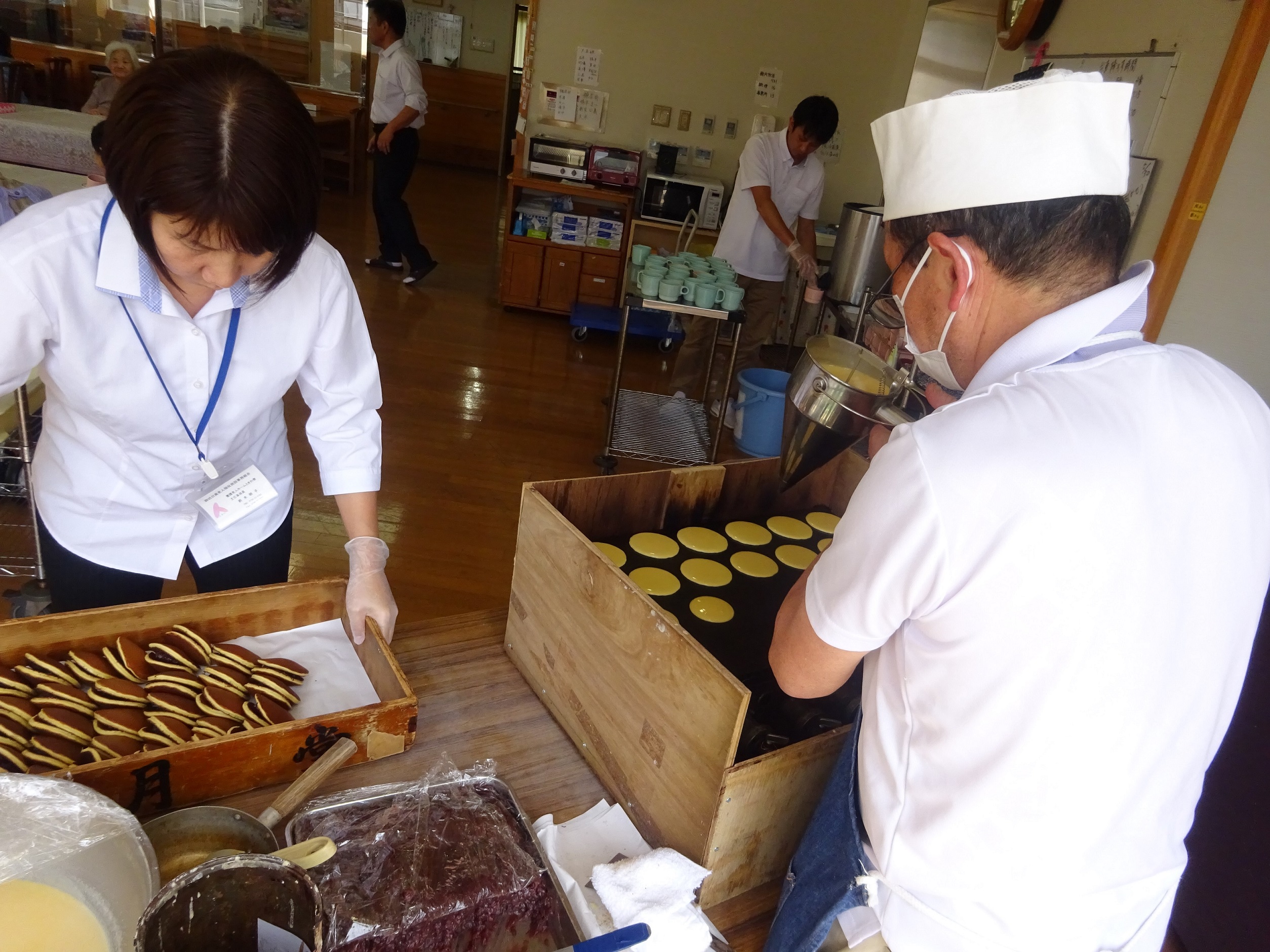 甘ーい!香りにつつまれて、利用者の皆様に小池様より三笠饅頭を