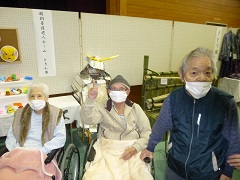 利用者様、家族様そろって、職員催しの、桃太郎の