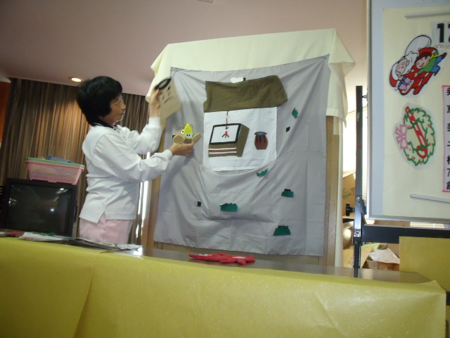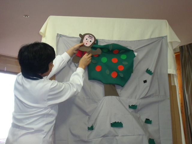 今回はコスモス棟職員による人形劇おこないました。(サルかに