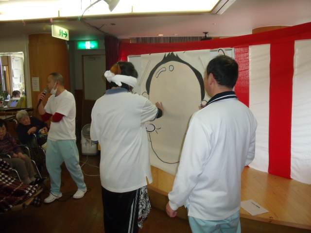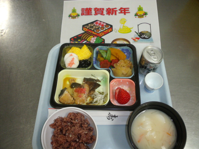 飾りおせち料理振る舞い昼から正月レクおこなっています。