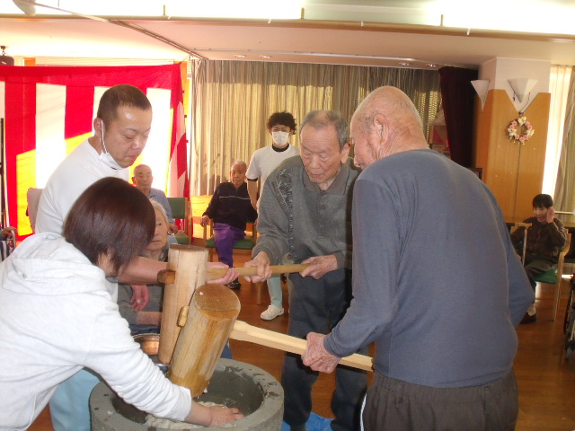 利用者の方も真剣な表情で餅つきおこなってくれます。