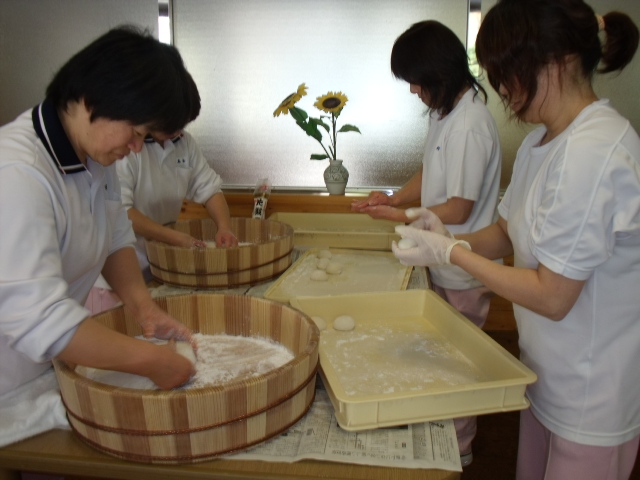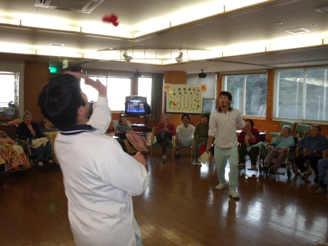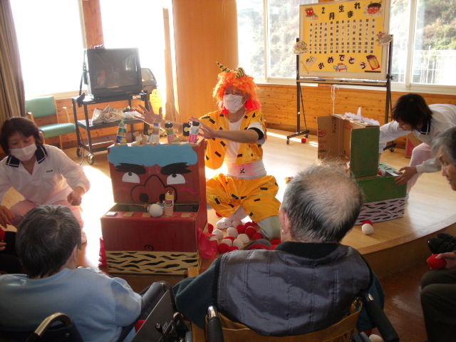 豆に代わり紅白の玉を使った玉投げで利用者の方々に