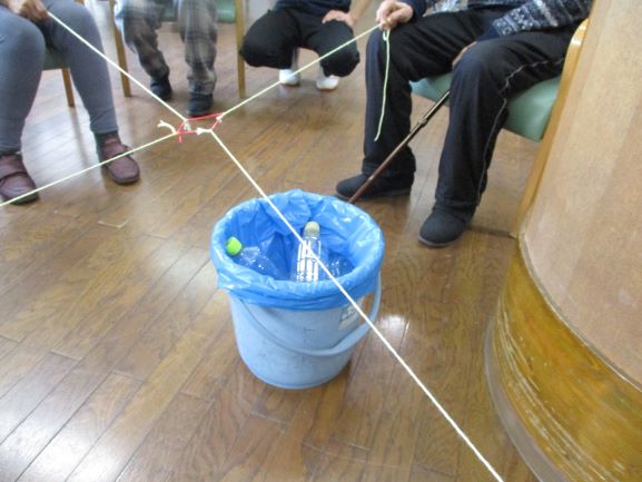 4人の息が合わないと、ペットボトルは持ち上がらず
