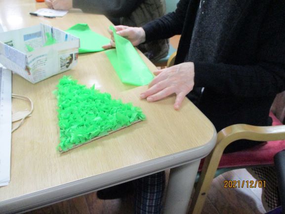 緑色のお花紙を小さくちぎり、