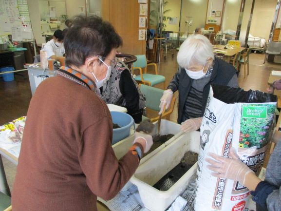 皆さんには暖かい室内でお花の苗を植えて頂きました。