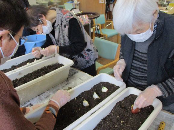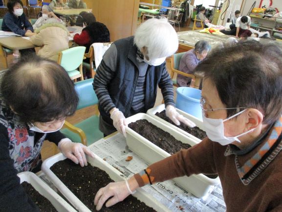 皆さんでプランターへ植えました。