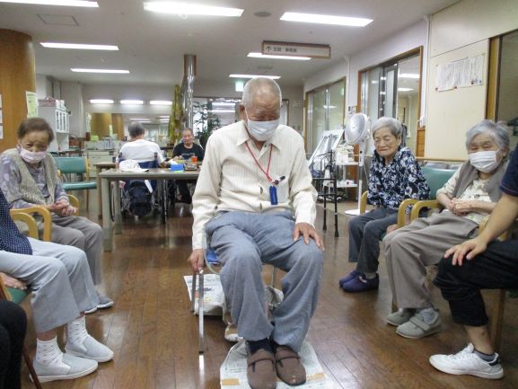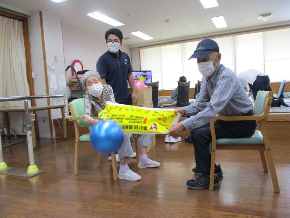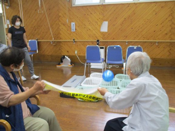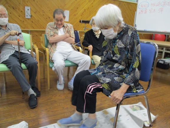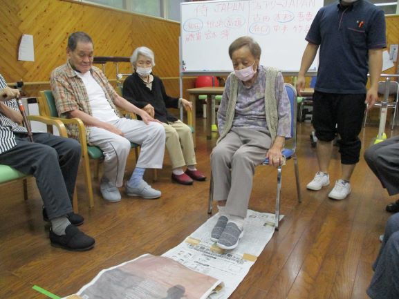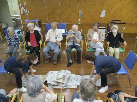 長く繋げた新聞紙をお互い足で手繰り寄せ、