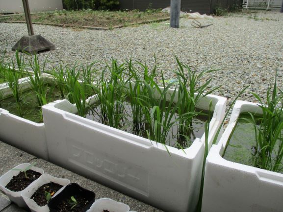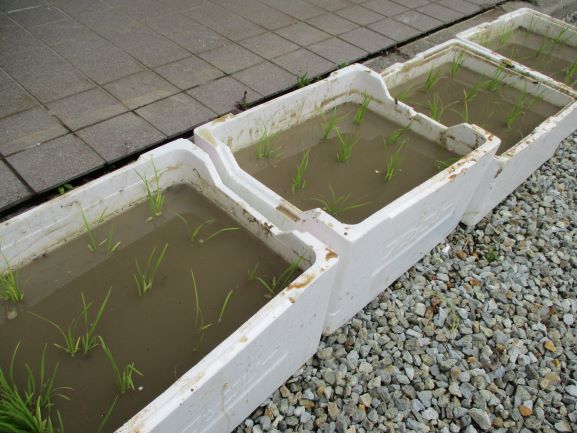 発砲スチロールに田んぼの土を入れ、水を張りました。