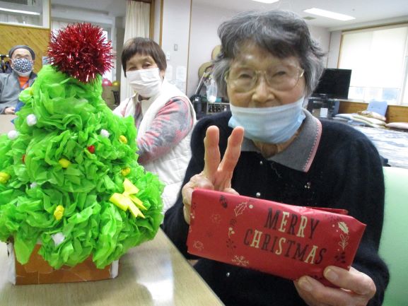 職員サンタからのプレゼントタイム、おやつはコーヒーとケーキで