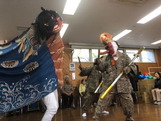 獅子舞と、鬼の面をつけた王仁、天狗の面を付けた和仁の