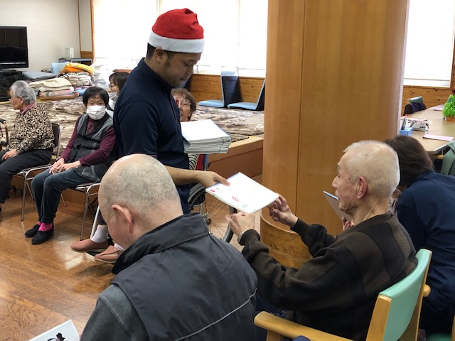 クリスマスソングの流れる中、職員扮するサンタクロースから、皆さんに