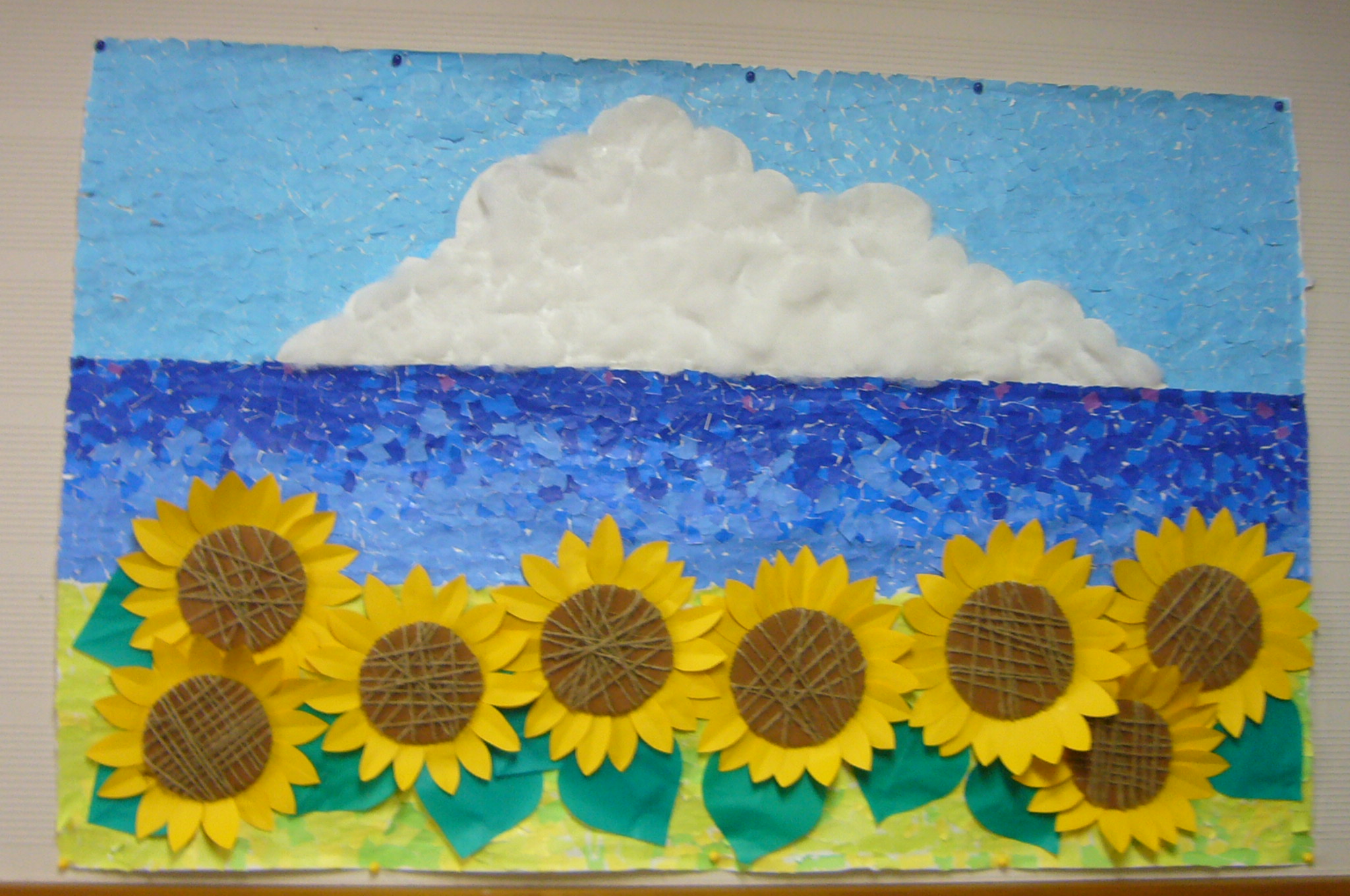 折り紙をちぎって貼ったり、麻紐を巻いたり、雲の部分には綿を貼り付けた