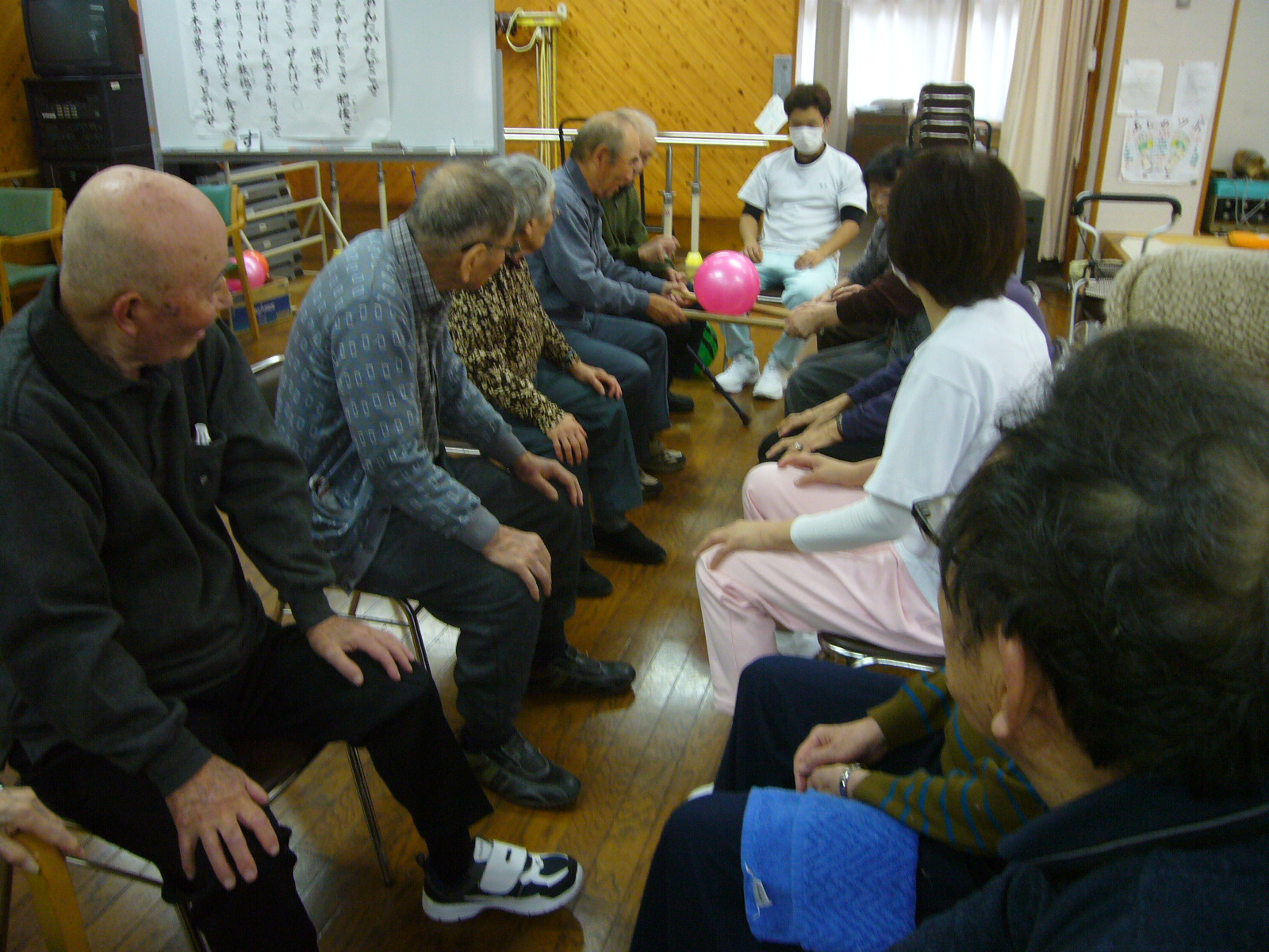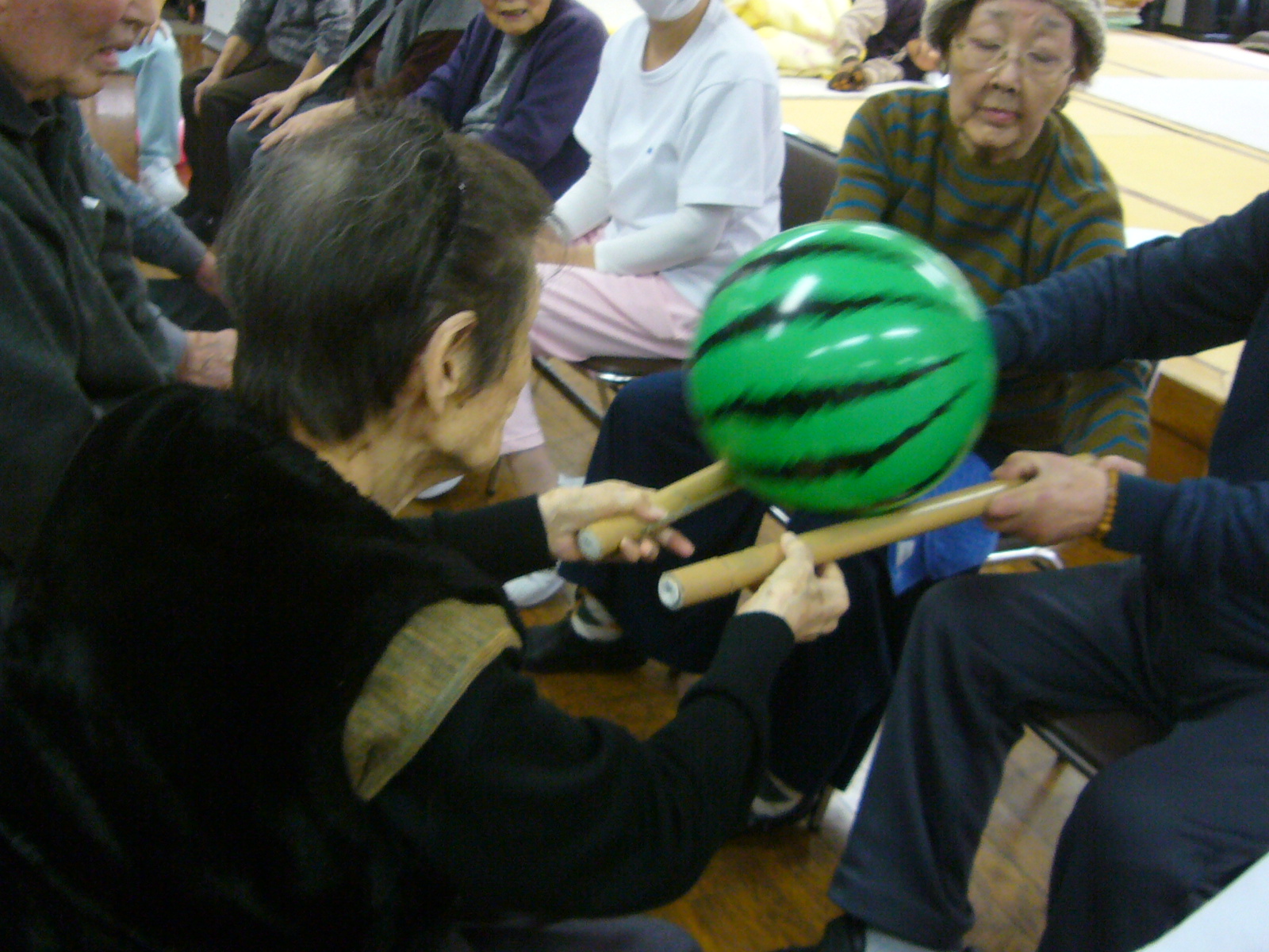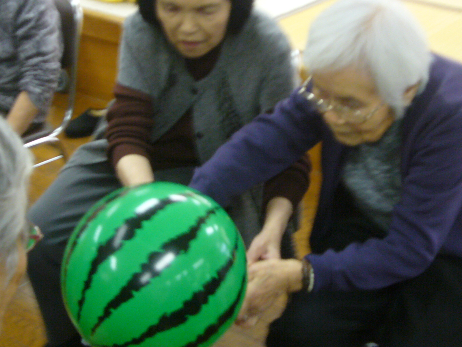 向かい側の方とペアになり、ビニールボールやゴムボール等、