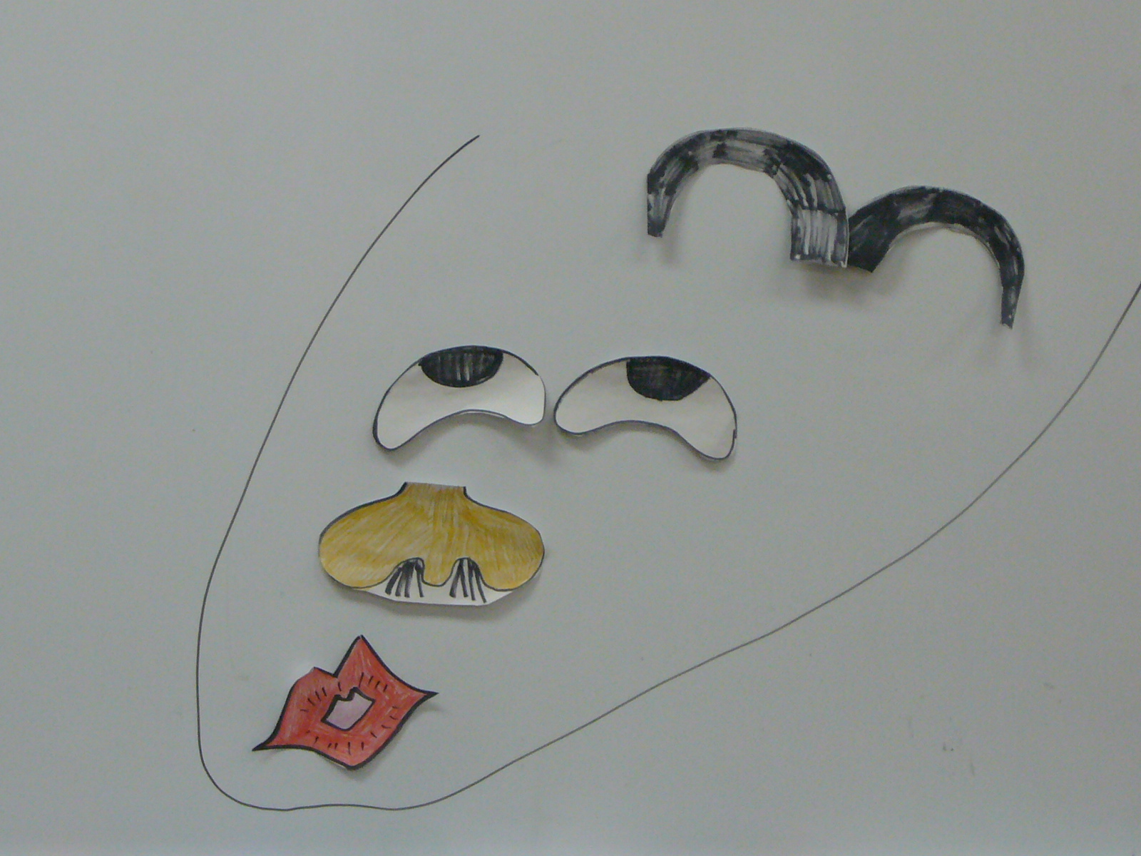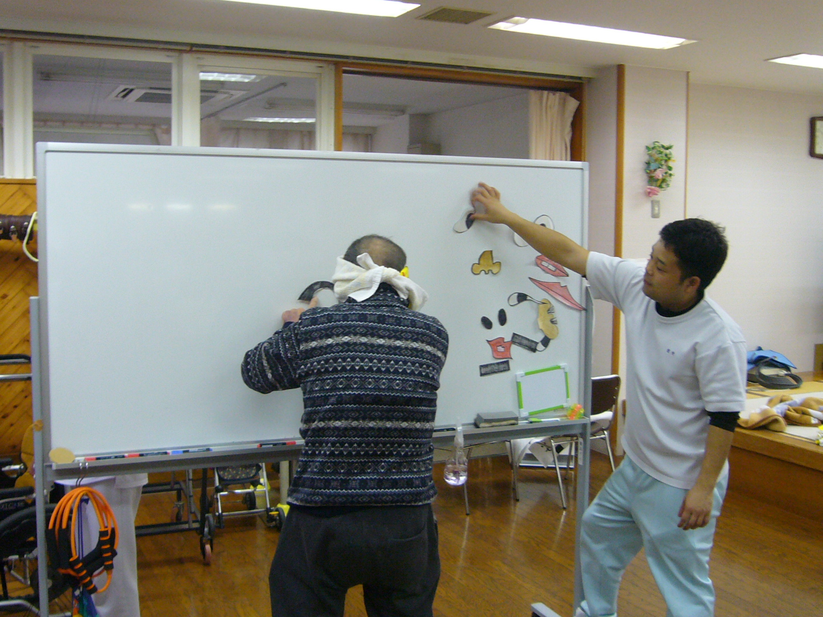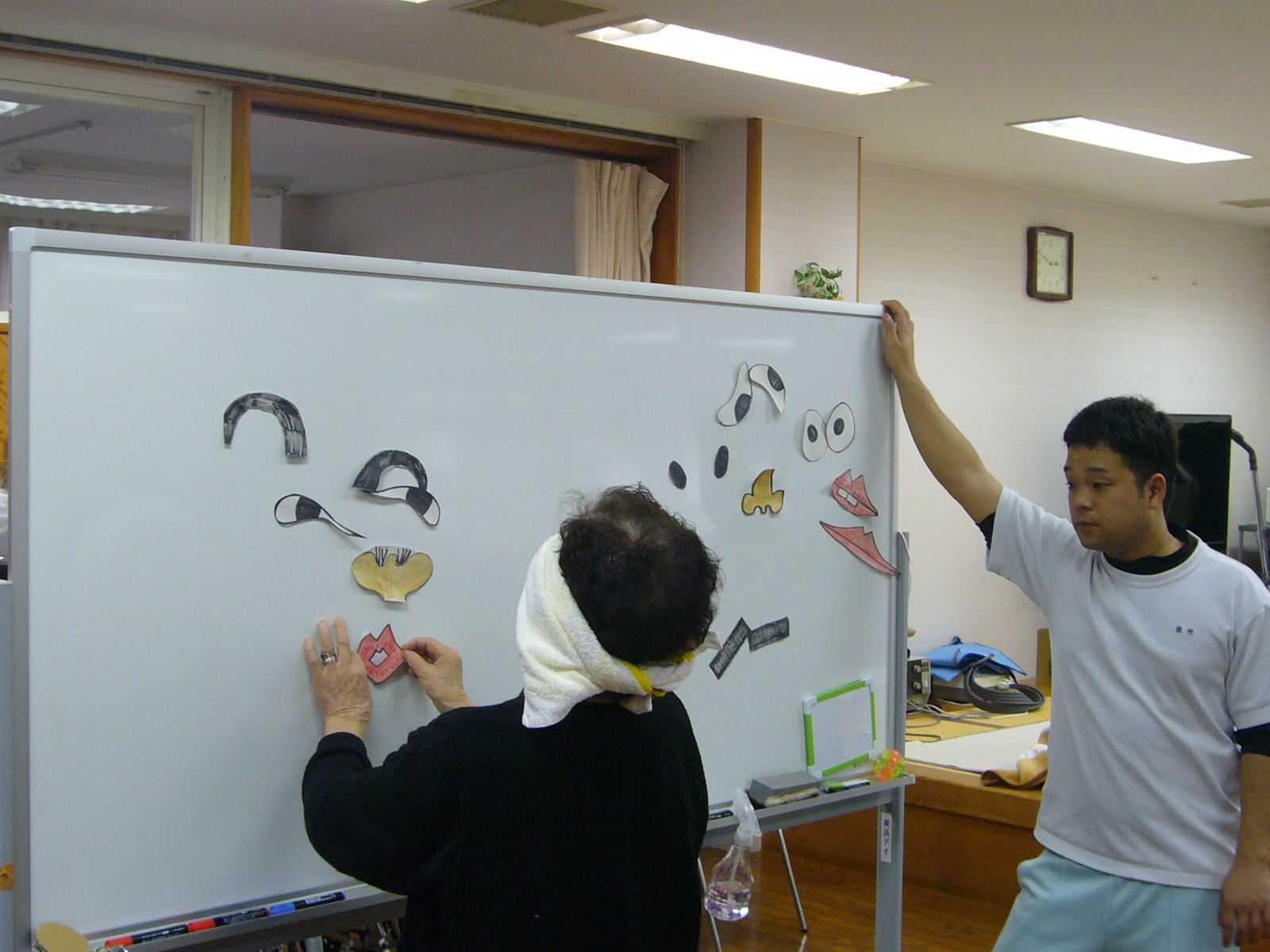 目隠しをして、皆さん、手探りで、ホワイトボードに目、鼻、口を