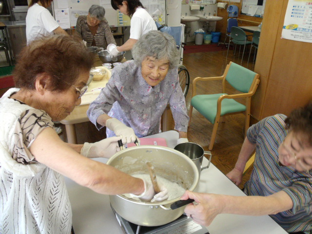 交代しながら混ぜたり、鍋を持ったり、できた餅を