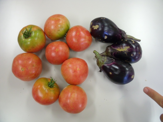 見てください、みんなで育てた立派なトマト!そして艶やかなナス!