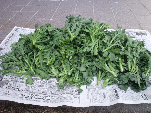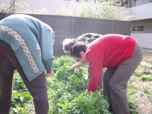 利用者さんと中庭の畑で春菊を作りました。