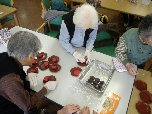 餅をこね、利用者の方が餅にあんこを詰め葉っぱをまいて