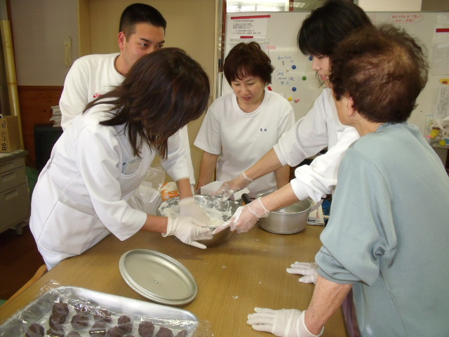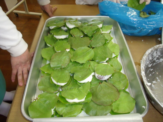 かしわ餅を作りました。職員がヨイショヨイショと