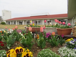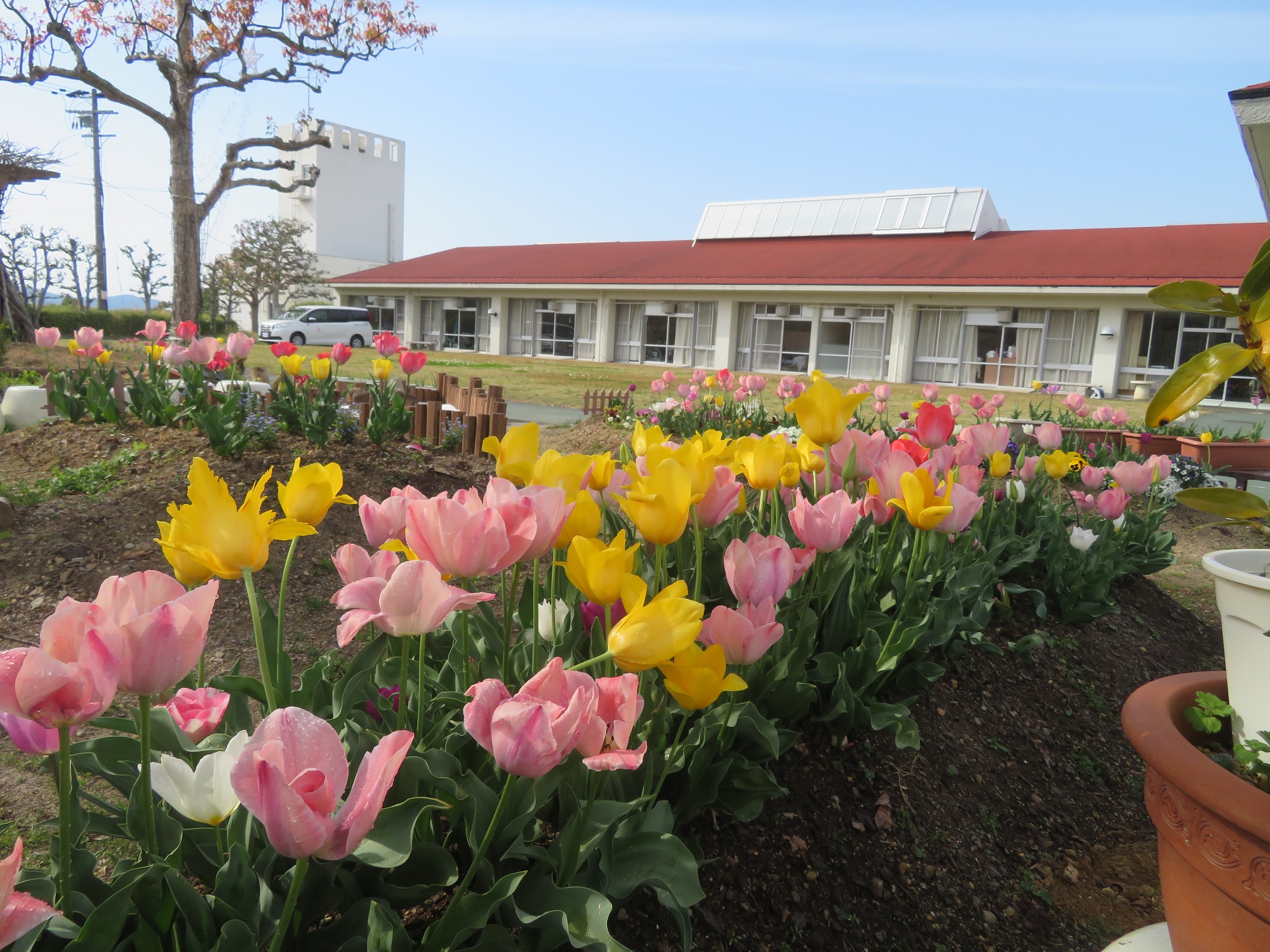 園庭〜かわべガーデン〜は、チューリップや色とりどりの花でにぎわい、
