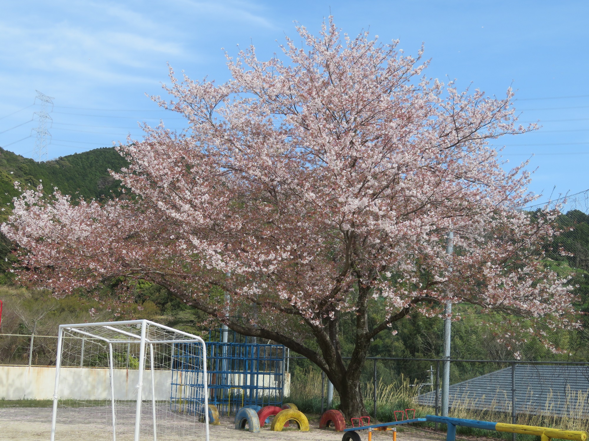 園庭の桜もきれいでしたが、山野小学校の大きな桜の木を見上げ、