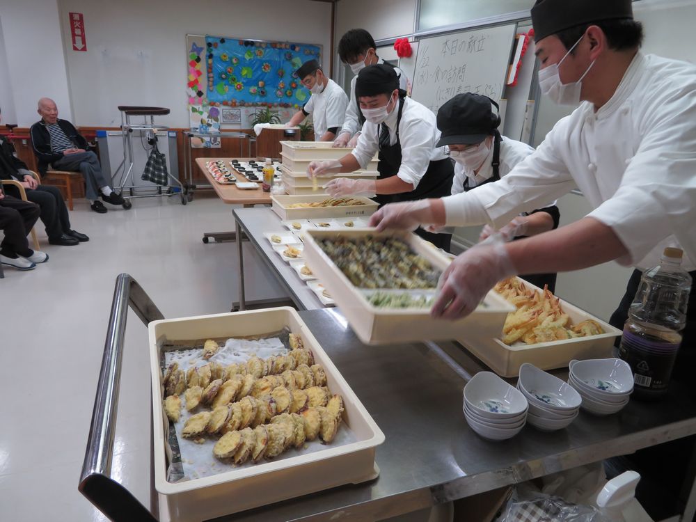 お寿司を握っているところや盛りつけを見学し、昼食にデイと入所者の皆様で