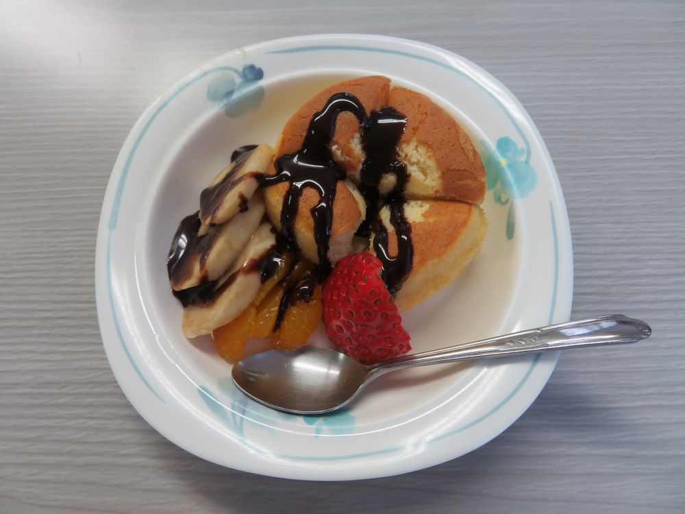 本日のメニューは、「フルーツパンケーキ チョコレートがけ」と、