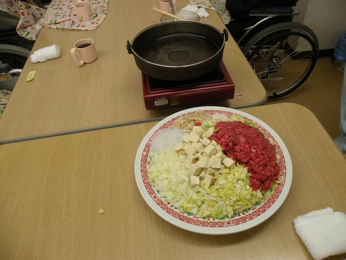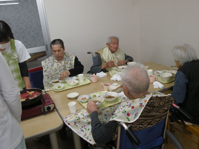 ビールやジュースで乾杯され、園内にすき焼きの甘辛い香りが漂い、普段と