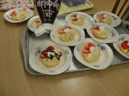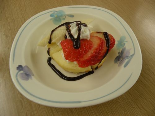 バレンタインで喫茶をしました。スポンジケーキの上にイチゴとバナナを