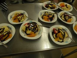カステラに果物を沢山盛りつけチョコをかけ喫茶を楽しんで