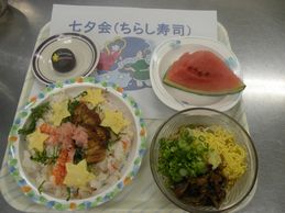 飾り付けに行きました。夕食に大人気のちらし寿司、そうめん、スイカ、