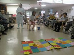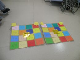 お手玉使って得点盤へ投げ入れ得点を競うゲームおこないました。
