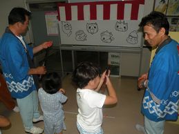 法被着ていただき園内に音楽流し夏祭りの雰囲気を演出しました。