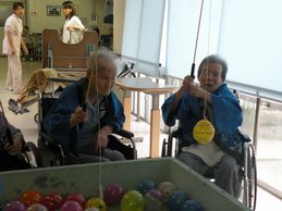 盆踊りで出店したヨーヨーつり・射的コーナーを利用者の方に
