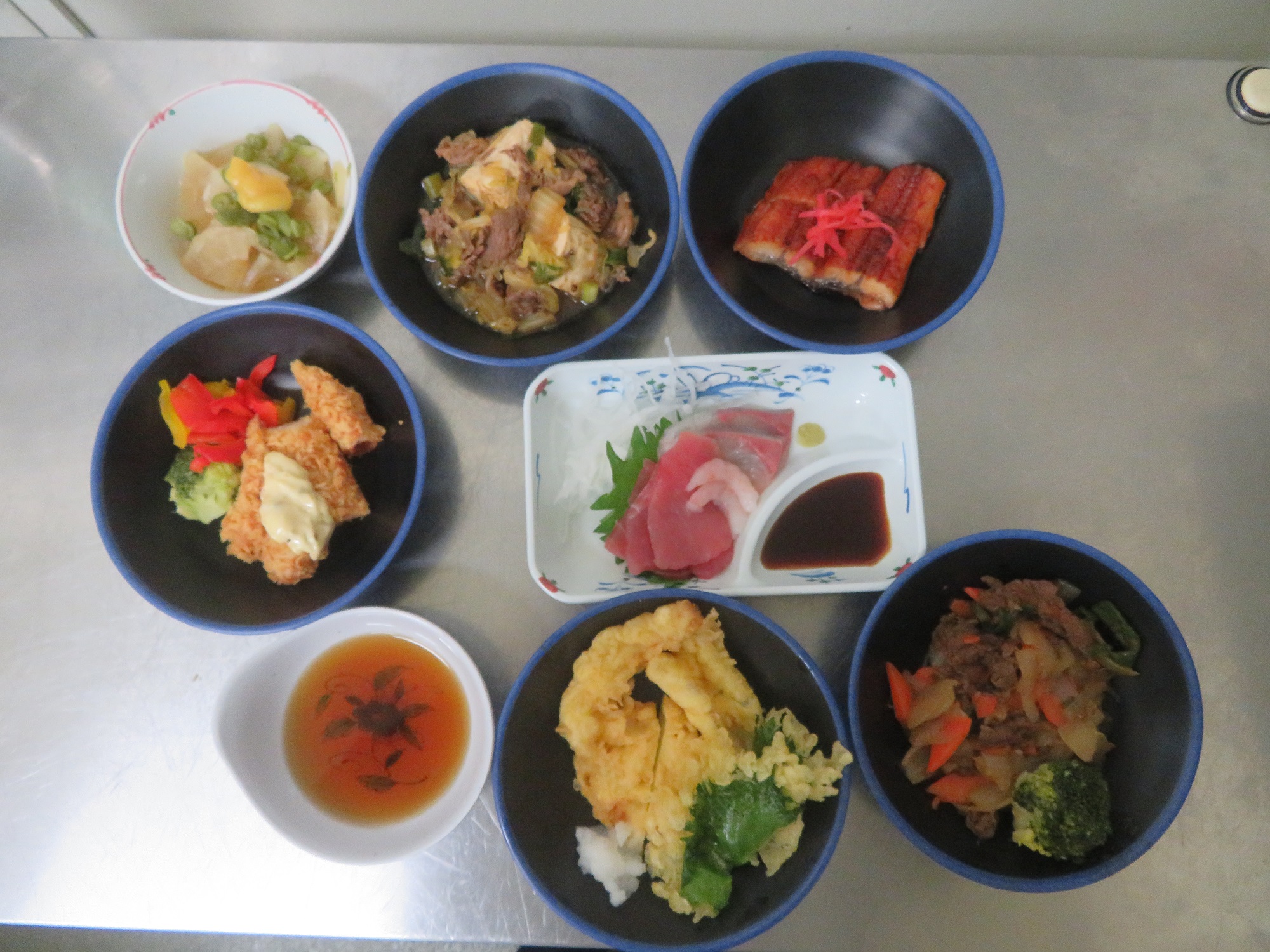 @刺身 Aエビフライ B天ぷら Cうなぎのかば焼き