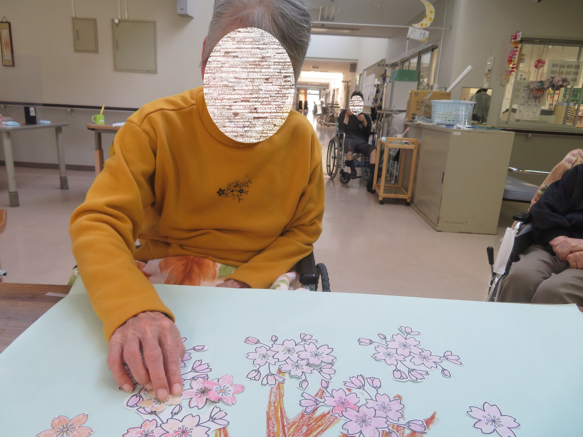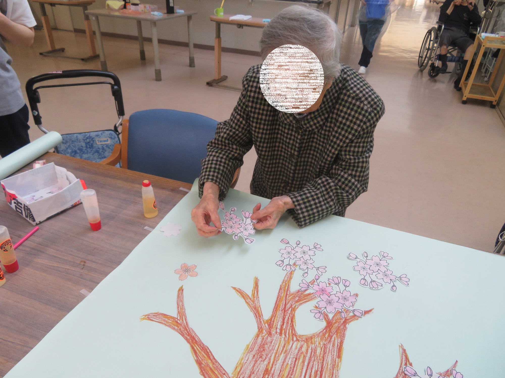 先日、塗り絵をした桜のイラストを切り取って、貼り絵をしました!