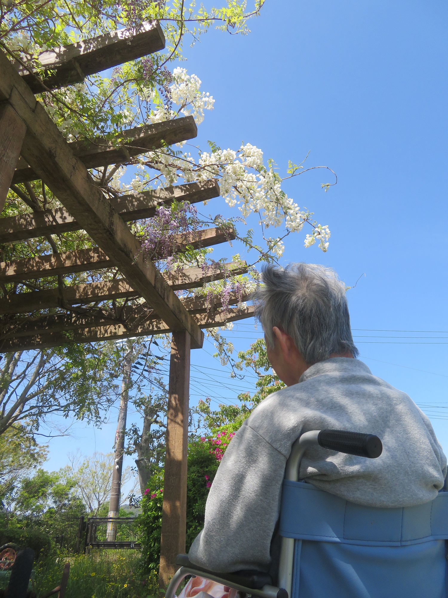 降り注ぐような藤の花を見上げて、