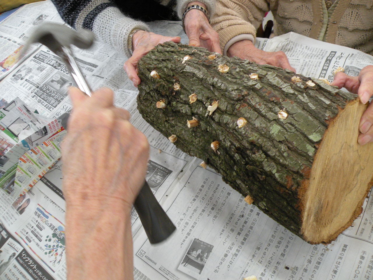 木に穴をあけて しいたけ菌を詰め込んで(´・ω・`)