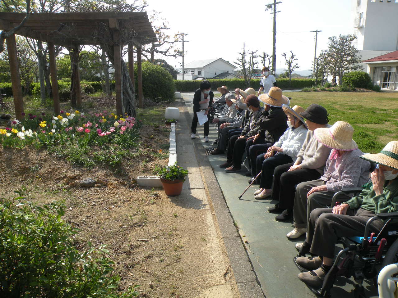 お天気が良い日には皆さんと川辺園の玄関まで散歩にいき