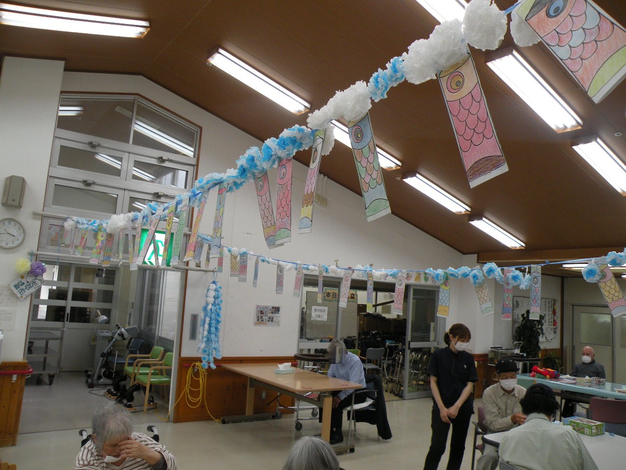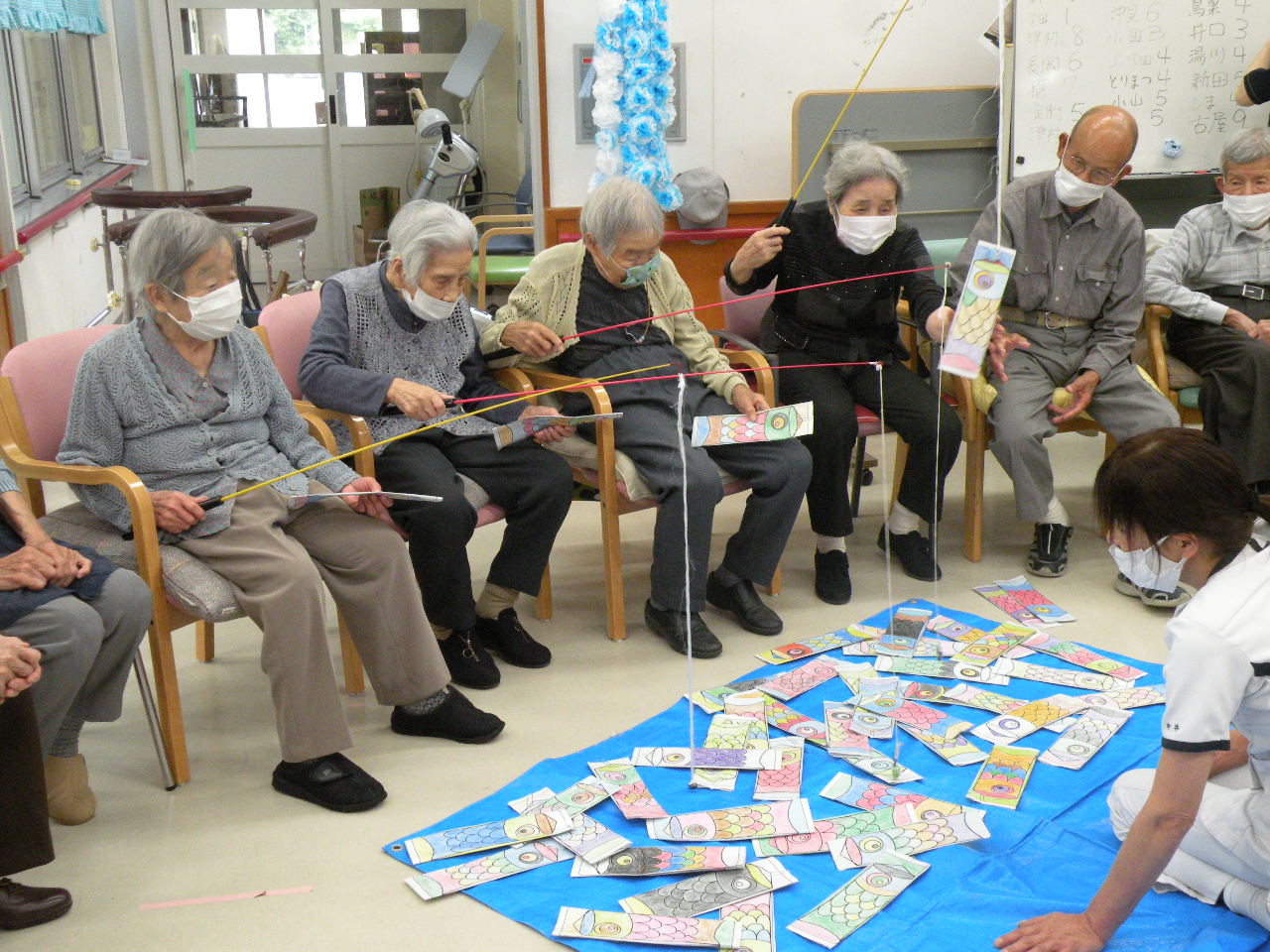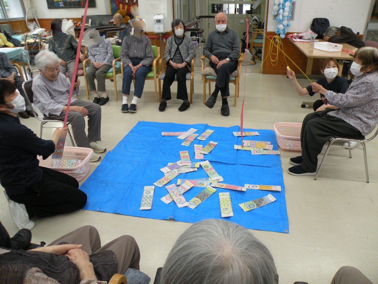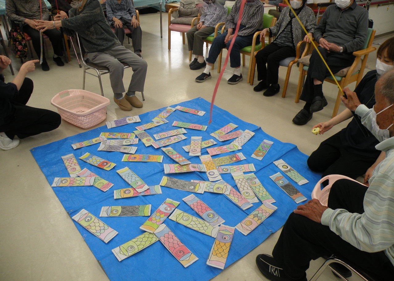 今月のレクリエーションは皆さんに色塗りして頂いた鯉のぼりを使って