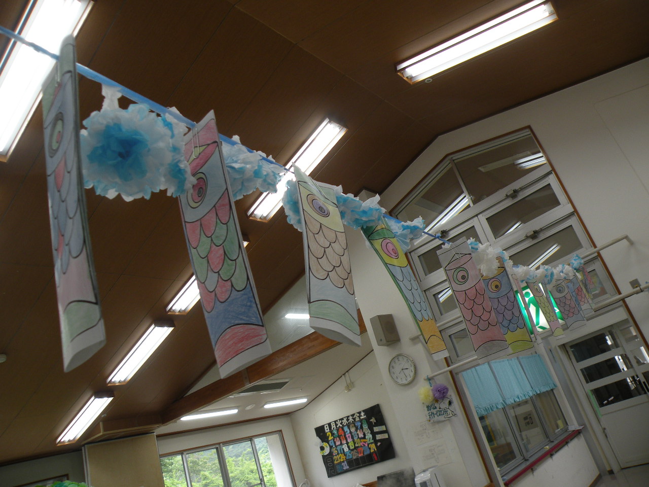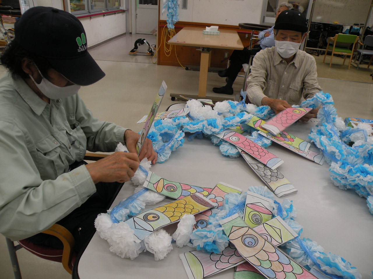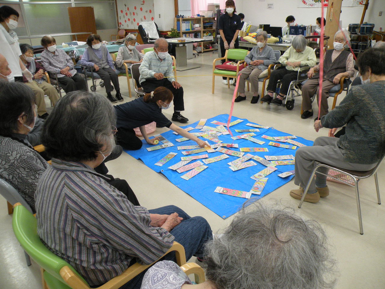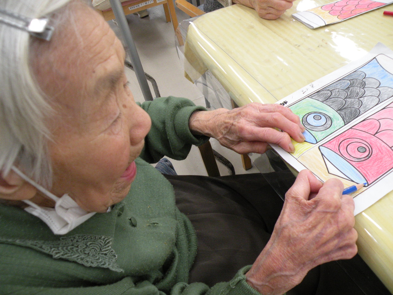 今月のレクリエーションは皆さんに色塗りして頂いた鯉のぼりを使って