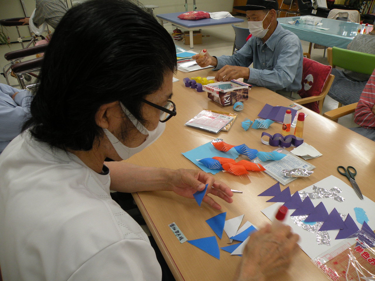 笹に飾りをつけて頂き、デイルームが七夕ムードです(^O^)
