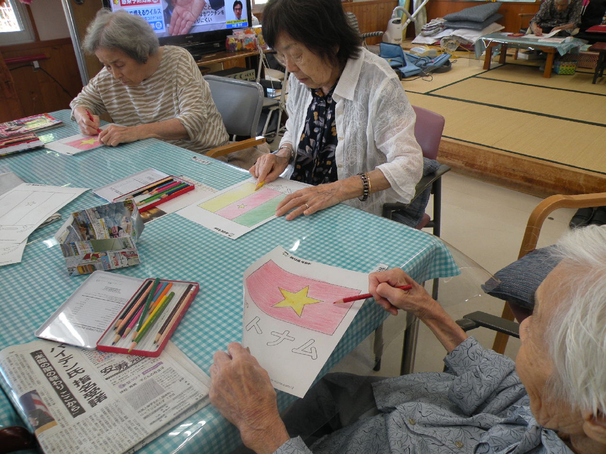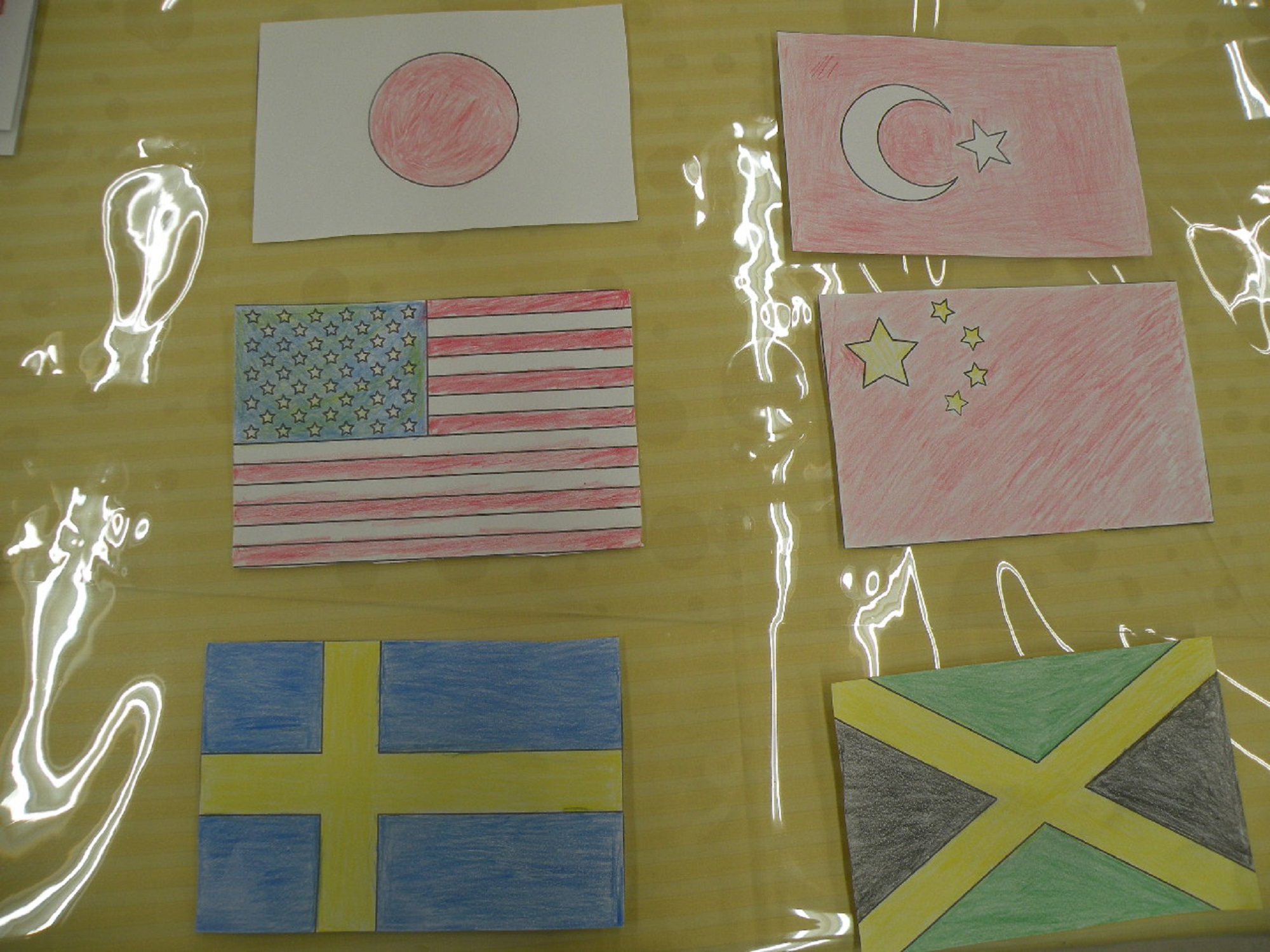 (↑) 9月に運動会を予定しており、その準備として皆様に国旗を色塗りして頂いています(*^▽^*)