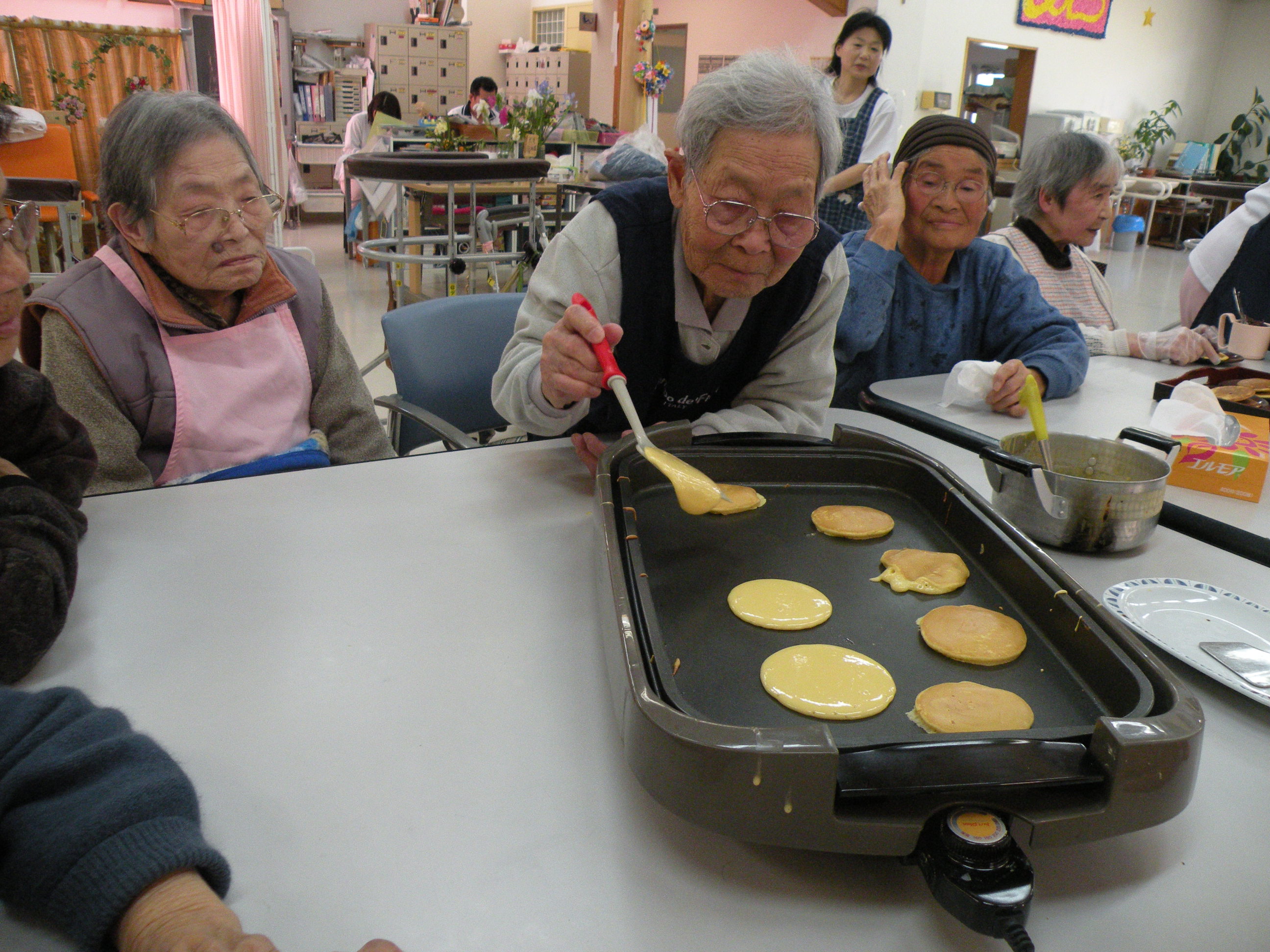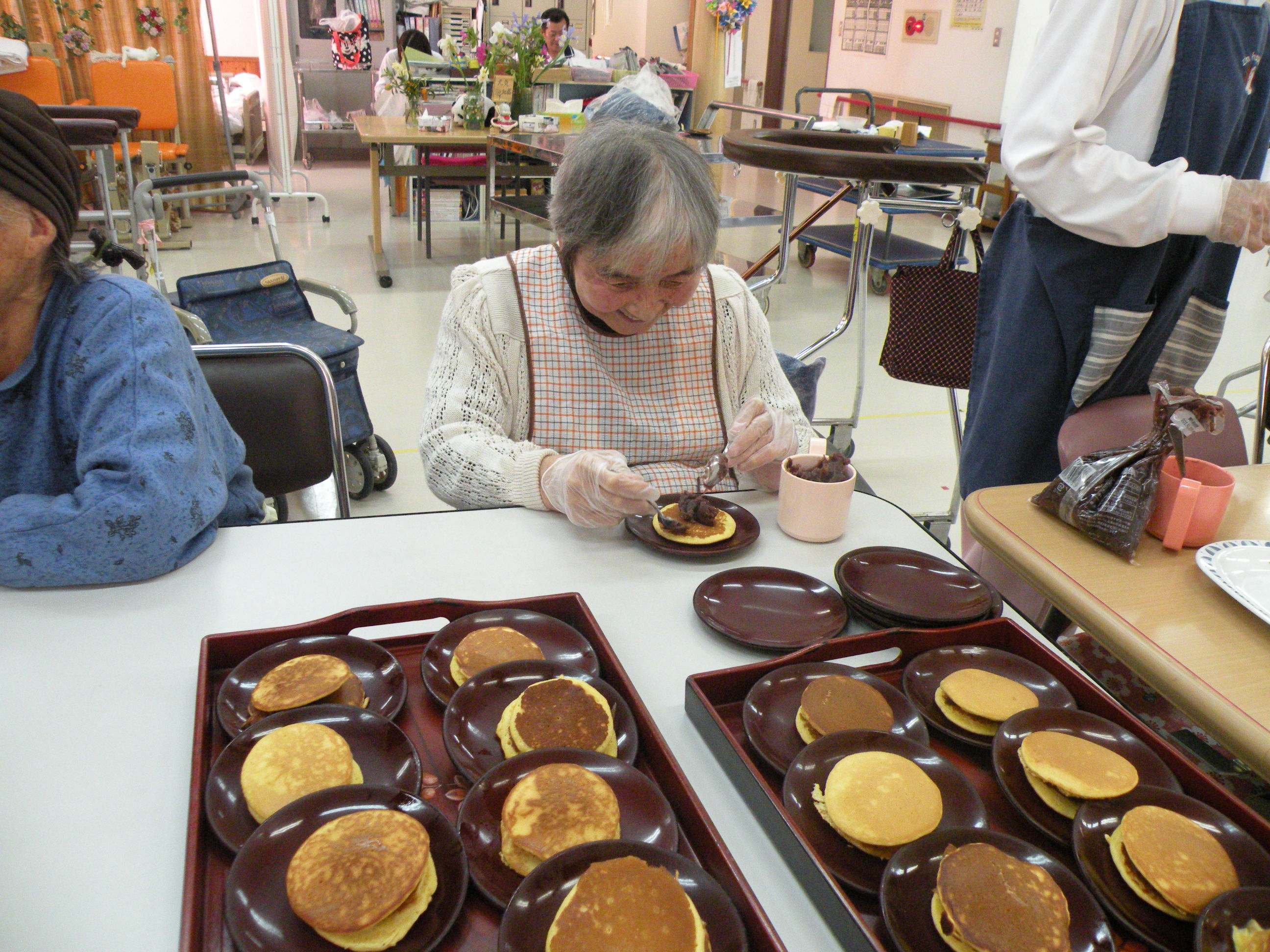 手作りおやつとして、どら焼き作りをしました。生地を丸く焼き、あんこをのせ、