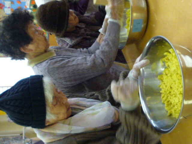 サツマイモの皮を剥いたり、潰す、丸める作業を皆さんにも手伝って