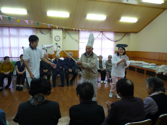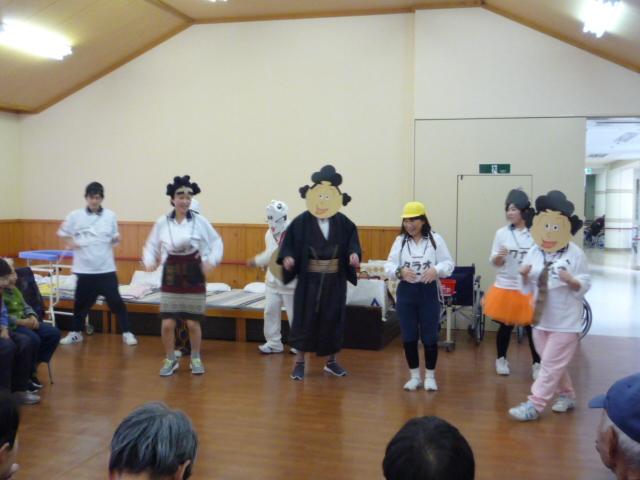 今年のクリスマス会は職員がサザエさん一家の格好をしました。